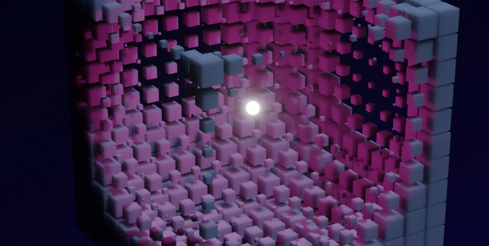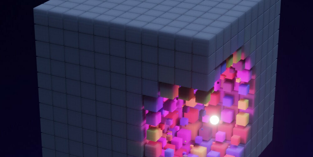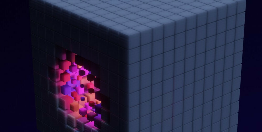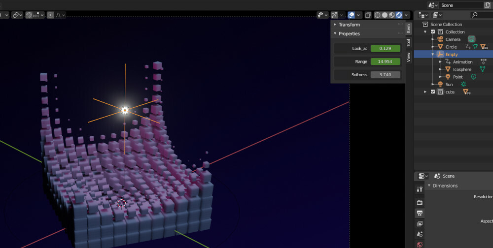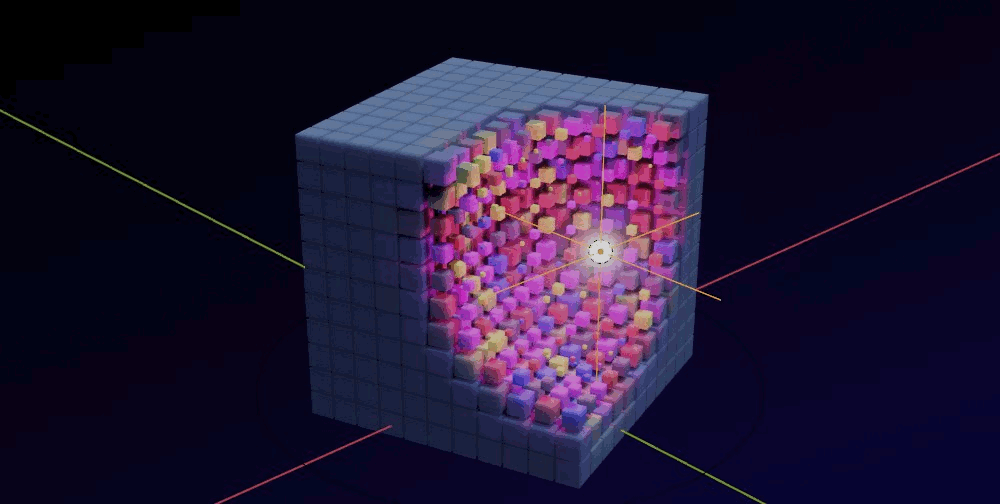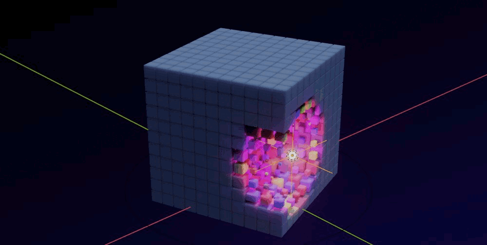 Cubes controlled by Drivers. Cubes scale down on Empty proximity. You can adjust Range, Softness and even Look At. The material is not Driver controlled.